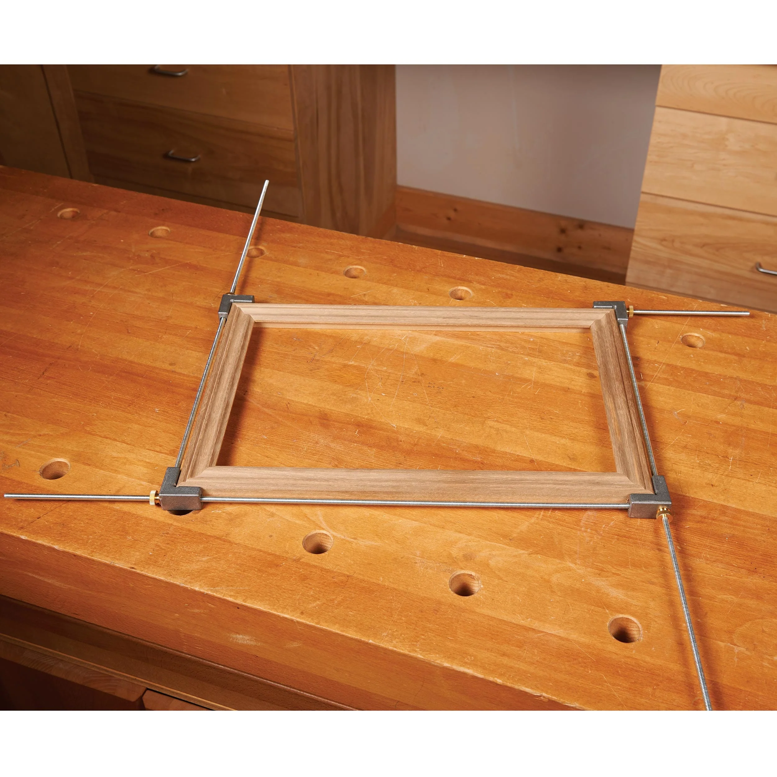 Use the WoodRiver® Picture Frame Miter Clamp to easily clamp all styles of picture frames up to 48" x 48". The plated rods are fully threaded and the included thumb nuts make accurate adjustments of the corners quick and easy. You may also use this miter clamp to clamp small boxes and furniture. Features: Specifications: What's Included: